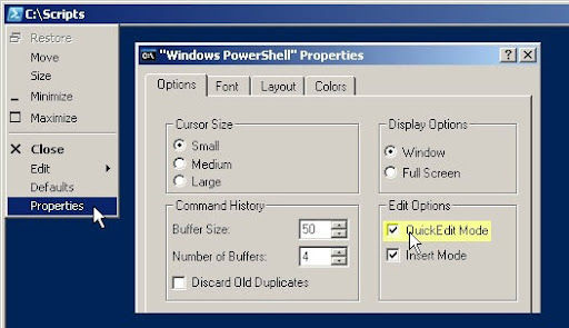 In QuickEdit mode, users can cut and paste text, to and from the command shell by using the mouse. There are three ways to change this behavior: