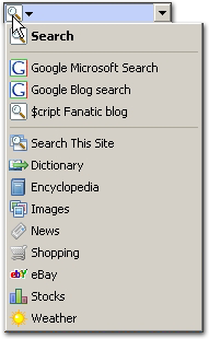 All web search is powered by Google. Besides the default "Search" entry I've added additional search providers to the bar. For example, the "Google Microsoft search" option allows you to search inside Microsoft related sites. There's also the option to search blogs with "Google blog search".